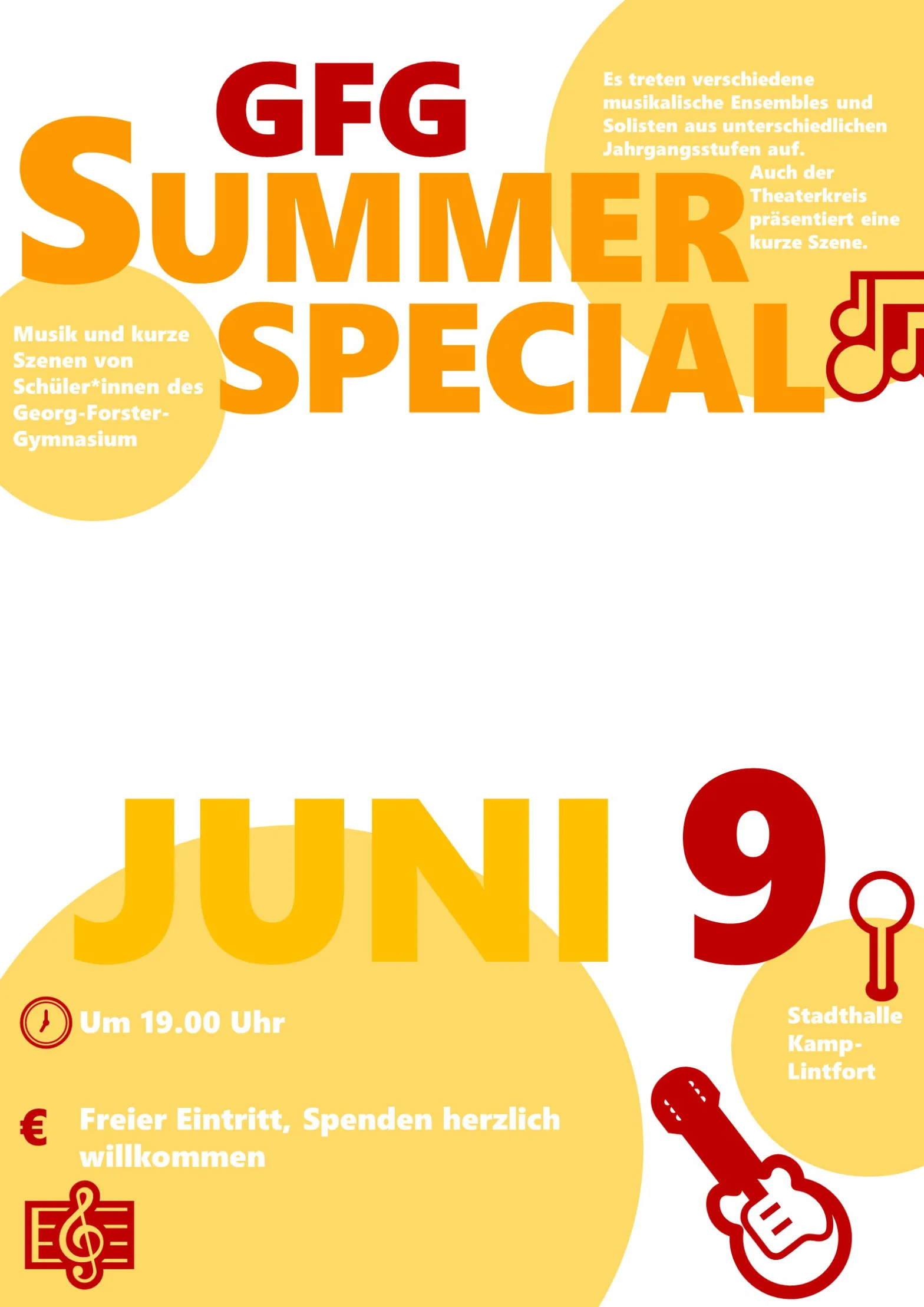 Herzliche Einladung am Freitag den 9. Juni zu unserem Sommerspecial Konzert am GFG! Um 19.00 Uhr geht es los in der Stadthalle! Auf Sie warten unsere Ensembles des GFG und der Theaterkreis mit einem spannenden, abwechslungsreiches Programm von Filmmusik „Amelie“, über klassische Stücke wie die „Pavane“ von Gabriel Faure, bis hin zum HardRock von Bon …