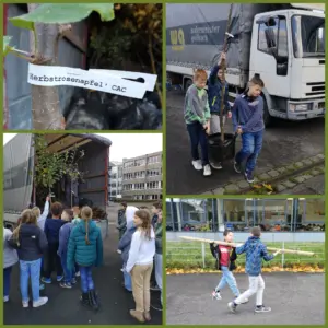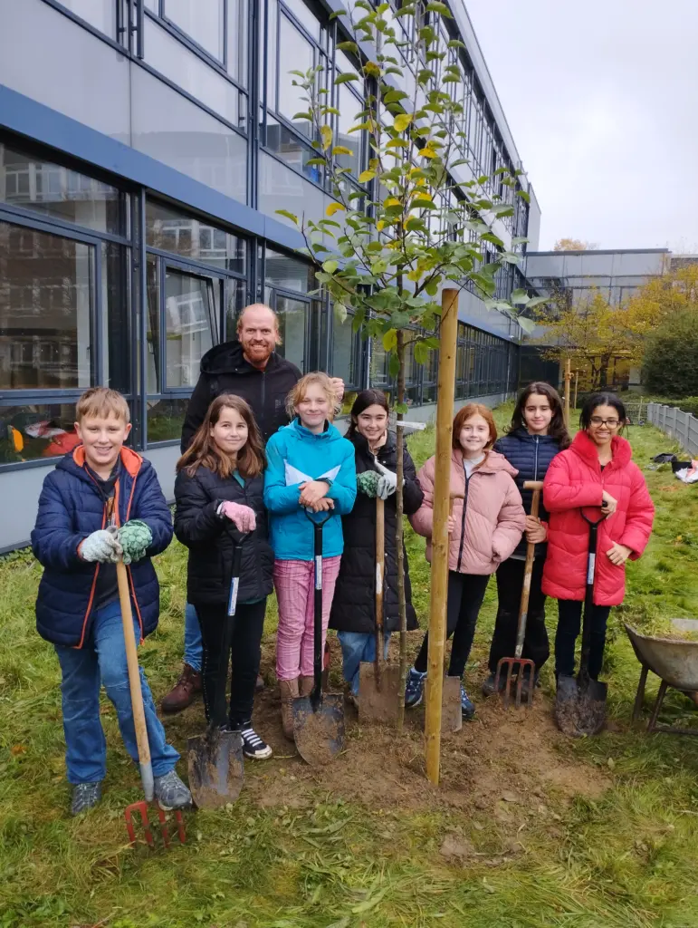 Die Wurzelballen wurden über die Woche feucht gehalten und der genaue Standort mit dem Grünflächenamt der Stadt Kamp-Lintfort abgesprochen. Am Freitag war es dann soweit und die Kinder der Umwelt-AG pflanzten unter Anleitung von Herrn Kouker die drei Obstbäume vor dem Grünstreifen der 30er Räume ein.