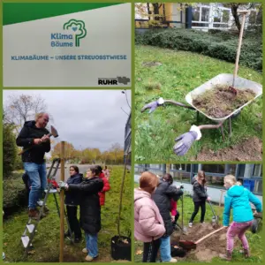 Im letzten Winter bewarb sich das GFG beim Regionalverband Ruhr auf die Aktion „Klimabäume – Unsere Streuobstwiese“. Wie wir vor kurzem erfuhren, gehört unsere Schule tatsächlich zu den auserwählten Institutionen. Am letzten Montag nahm die Klasse 5b unsere drei Klimabäume in Empfang und platzierte sie windgeschützt vor dem SV-Fenster.