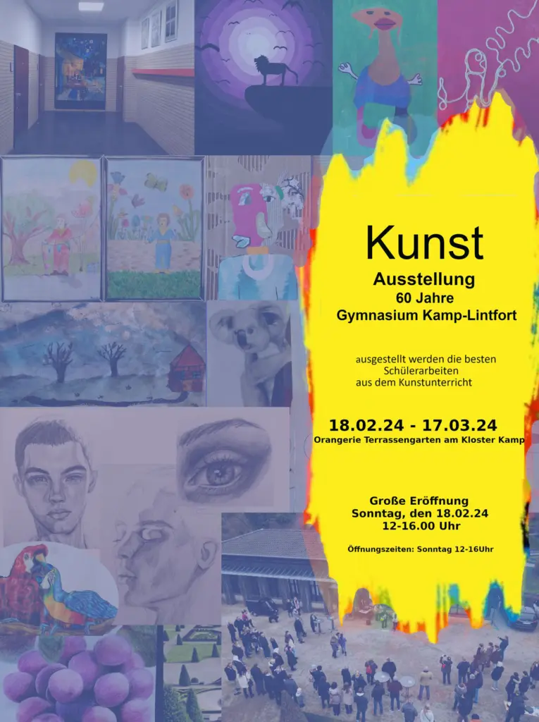 Leichter Nieselregen wehte um das Kloster Kamp – und doch strömten Interessierte aus allen Richtungen in die Orangerie: Das Georg-Forster-Gymnasium eröffnete am vergangenen Sonntag feierlich die „Kunst-Ausstellung 60 Jahre Gymnasium Kamp-Lintfort“ mit mehr als 180 ausgesuchten Schülerarbeiten aus dem aktuellen Schuljahr in Mitten der Kulisse des Terrassengartens.